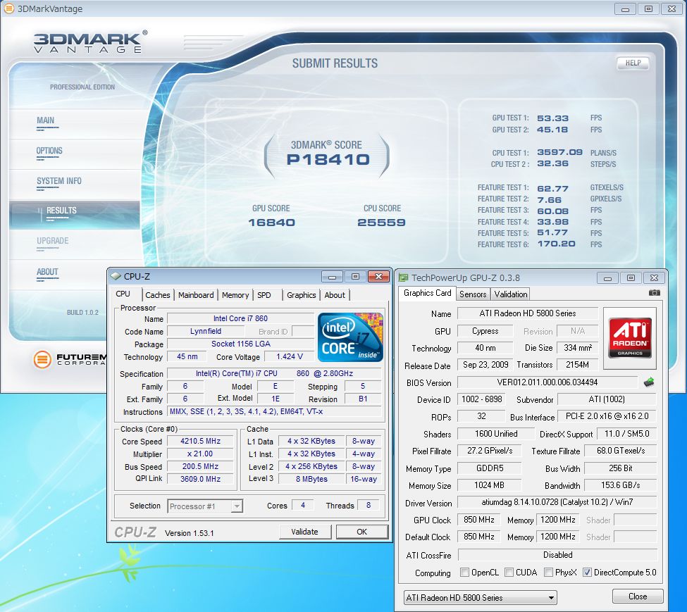 ・5850+5850 A-MODE:3DMark Vantage P20199,GPU Score 20976