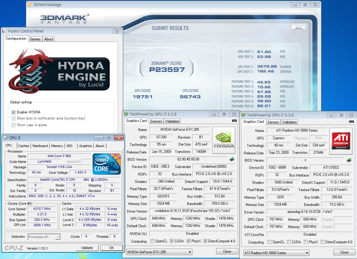 このバージョンでは、HD5870+GTX285の組み合わせでは、HYDRAが機能しませんでした。