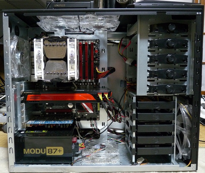 上記構成でケースファンはトップに120mmx2、ボトムx1、リアx1にフロント200mmx1の計5個搭載。
