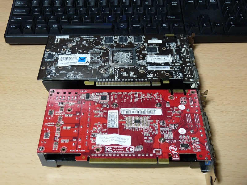 GTS450(上)と蛙GTX460(下)のカード長さ比較。