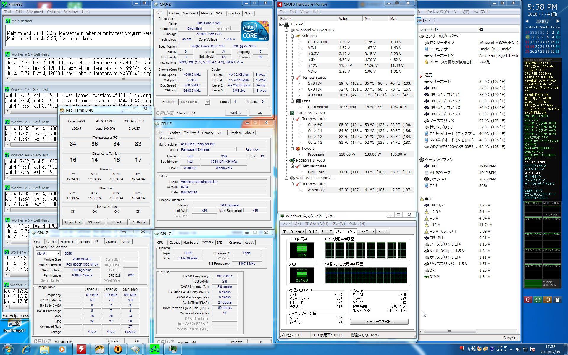 Vcore1.275、 CPU PLL1.82 QPI/DRAM1.25にてPrime95を激走しました。