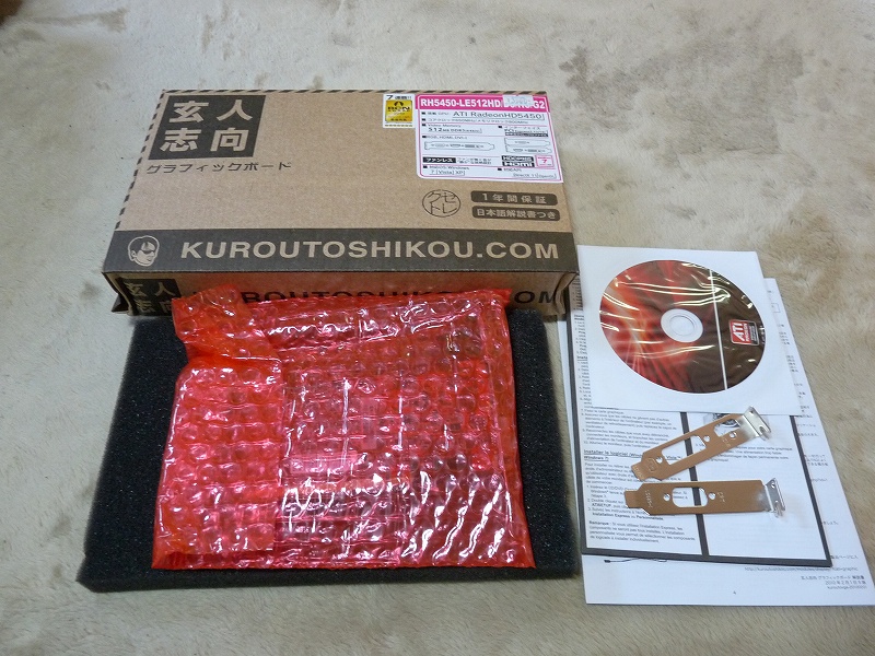 カード本体に、ロープロ用ブラケット、ドライバーCDと説明書。