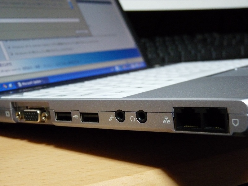 向かって左側にはD-sub出力、USBx2、イヤホン、マイク、LAN+モジュラージャック。