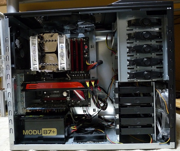 上記構成でケースファンはトップに120mmx2、ボトムx1、リアx1にフロント200mmx1の計5個搭載。