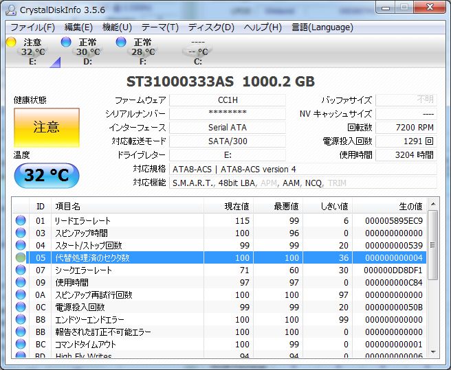 温度は高いわ、消費電力も多いし、何より代替セクタ黄色だし。