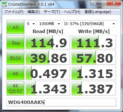 そんなわけで、今使ってるWD6400AAKSが現状どんなものかCDMで計測。