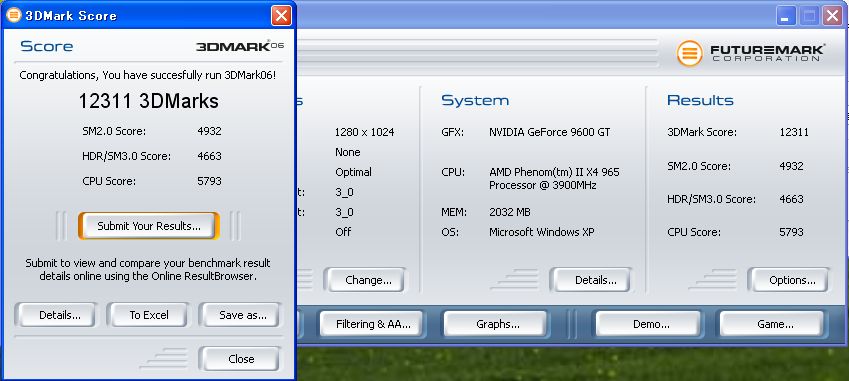 | XP 1280x1024 9600GT | 12311 | 4932 | 4663 | 5793 |