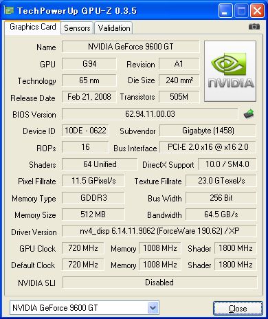今回使用した、GIGABYTE GV-NX96T512HPはOCモデル。