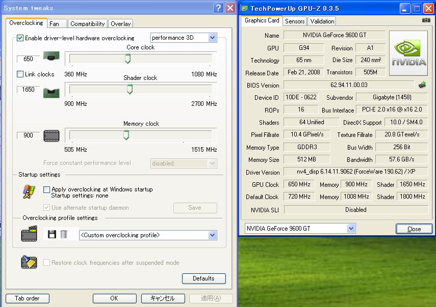 その為、リファレンス仕様までクロック/シェーダー/メモリを落とした擬似9600GTリファレンスの性能も計測。